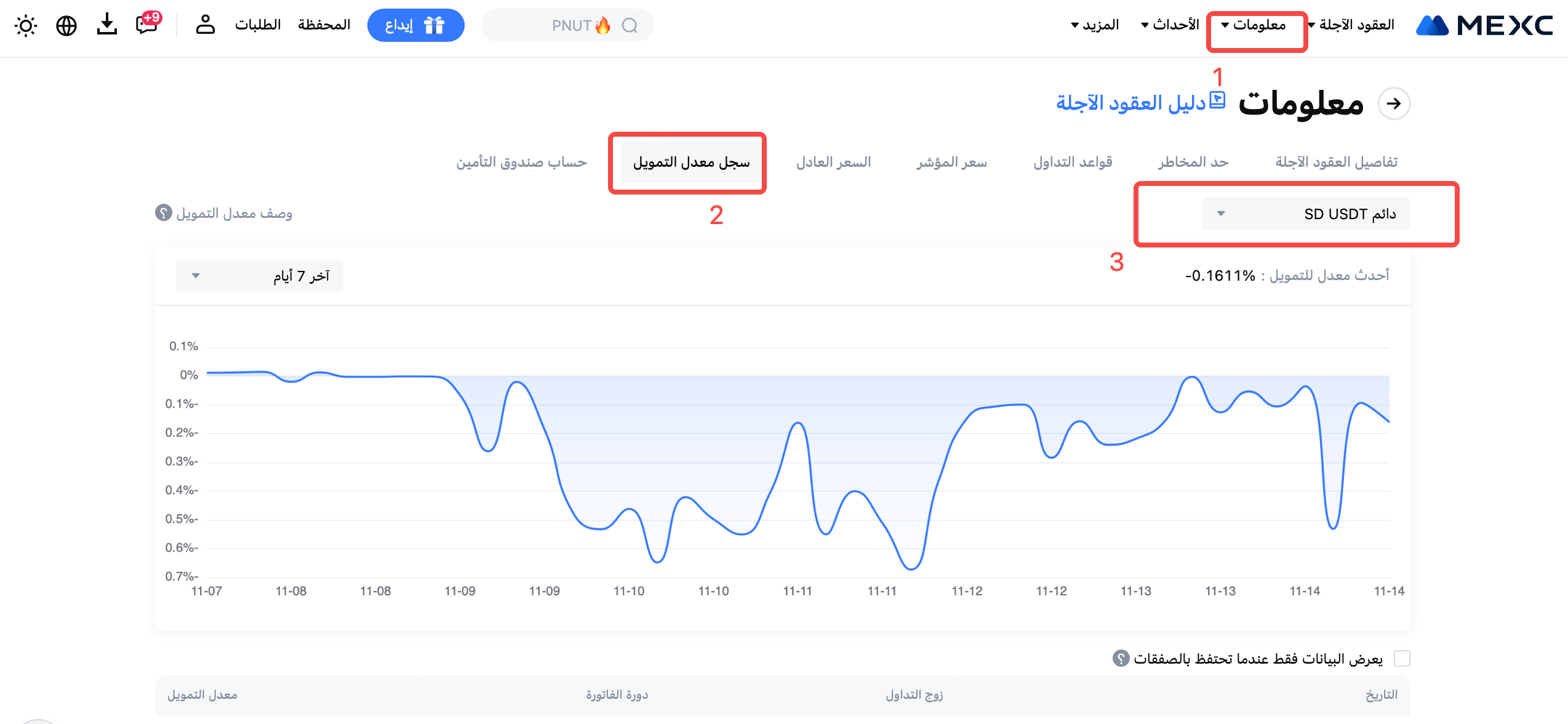 في الساعة 11:40، 14 نوفمبر 2024 (UTC)، قامت MEXC بتعديل وتيرة تسوية معدل تمويل عقود MEXC SD USDT-M الآجلة. أصبح معدل التسوية الجديد الآن مرة واحدة كل 8 ساعات. التفاصيل كما يلي: