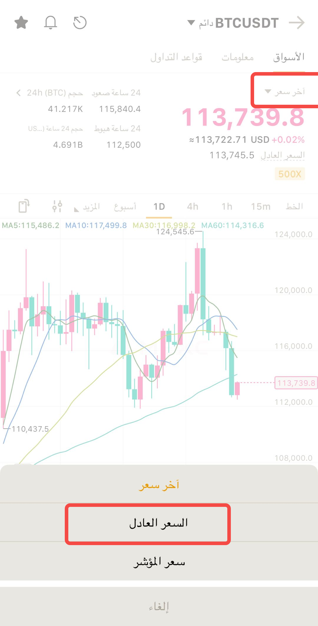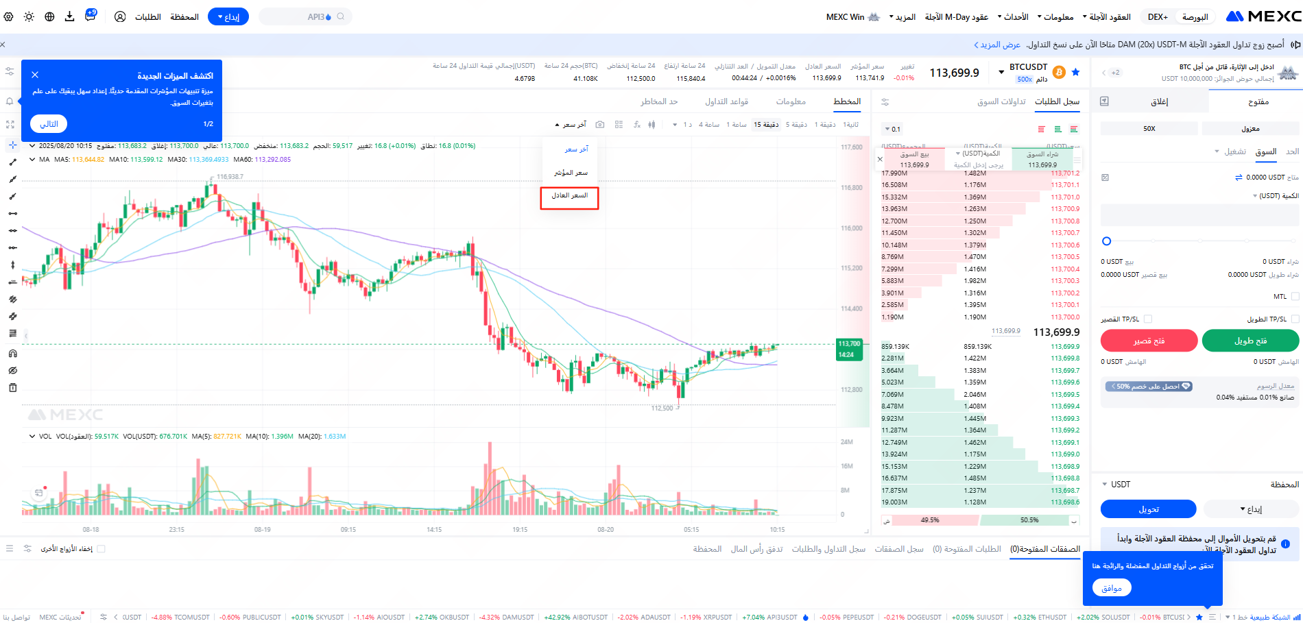 على منصة MEXC الإلكترونية، يمكن للمتداولين مراقبة السعر العادل مباشرةً باختيار السعر العادل أعلى مخطط الشموع. توفر هذه الميزة مستوى إضافيًا من الشفافية والتحكم عند إدارة الصفقات.