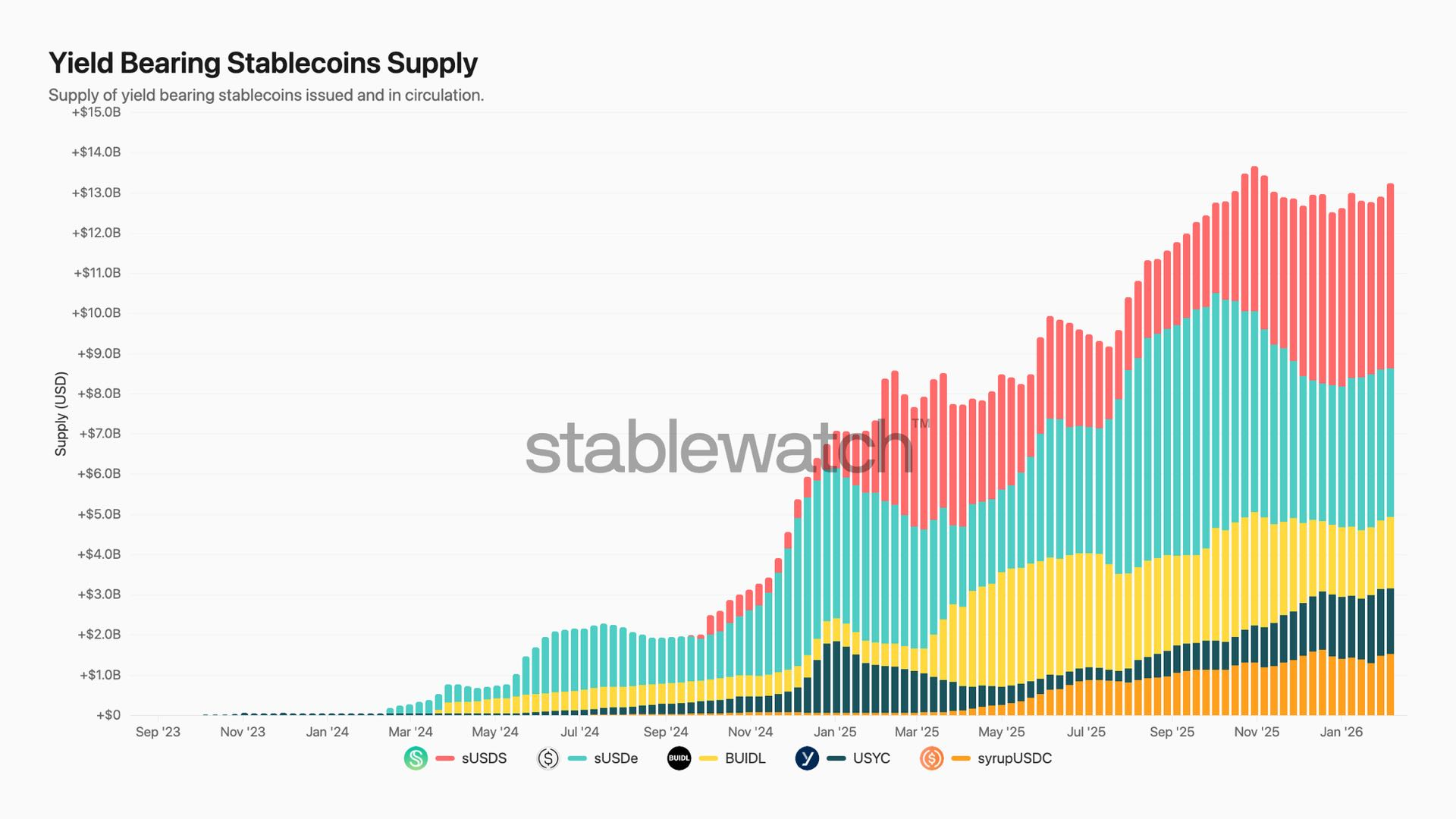 Rendite-tragende Stablecoins werden zu Kryptos neuer Cash-Basis. Das Angebot stieg in etwa zwei Jahren von nahezu Null auf über $13 Milliarden. Das ist kein Farm-Meta. Das ist Distribution.