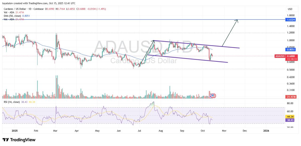 ADA is stuck in a long-term descending pattern, according to technical indicators. While a break above $0.90 might lead to a target of $1.88, according to analyst Ali Martinez, a break below $0.60 might lead to a prolonged decline towards $0.25 by 2026. The Cardano price remains vulnerable to further whale liquidation, especially if market liquidity weakens again.