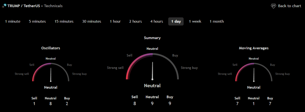The technical analysis indicators such as Relative Volume (RVOL), Moving Average (MA), and Relative Strength Index (RSI) of Official Trump (TRUMP) are shown in the chart below.