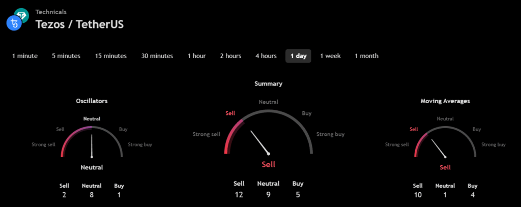The technical analysis indicators such as Relative Volume (RVOL), Moving Average (MA), and Relative Strength Index (RSI) of Tezos (XTZ) are shown in the chart below.