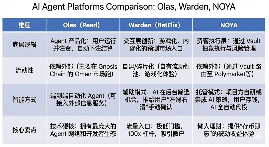 Currently, the prediction market agent sector is still in its early stages , with a limited number of projects. Some of the more representative ones include Olas (Pearl Prediction Agents) , Warden (BetFlix) , and Noya.ai.