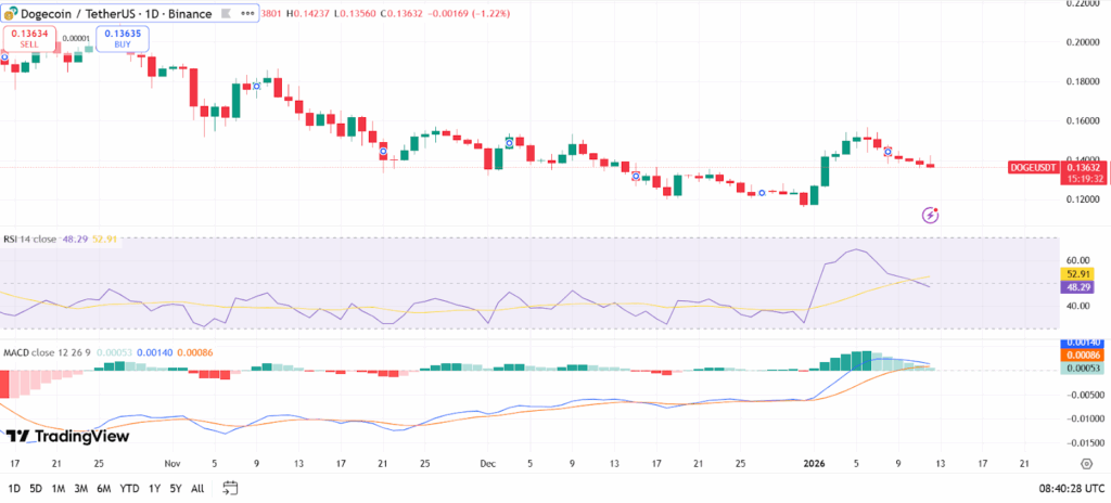 With that, analysing the 1-day chart of (DOGE/USDT), the Relative Strength Index (RSI) sits near 48, sitting in the neutral territory, neither overbought nor oversold region, which puts it right in the middle ground, not showing any extreme buying or selling pressure.