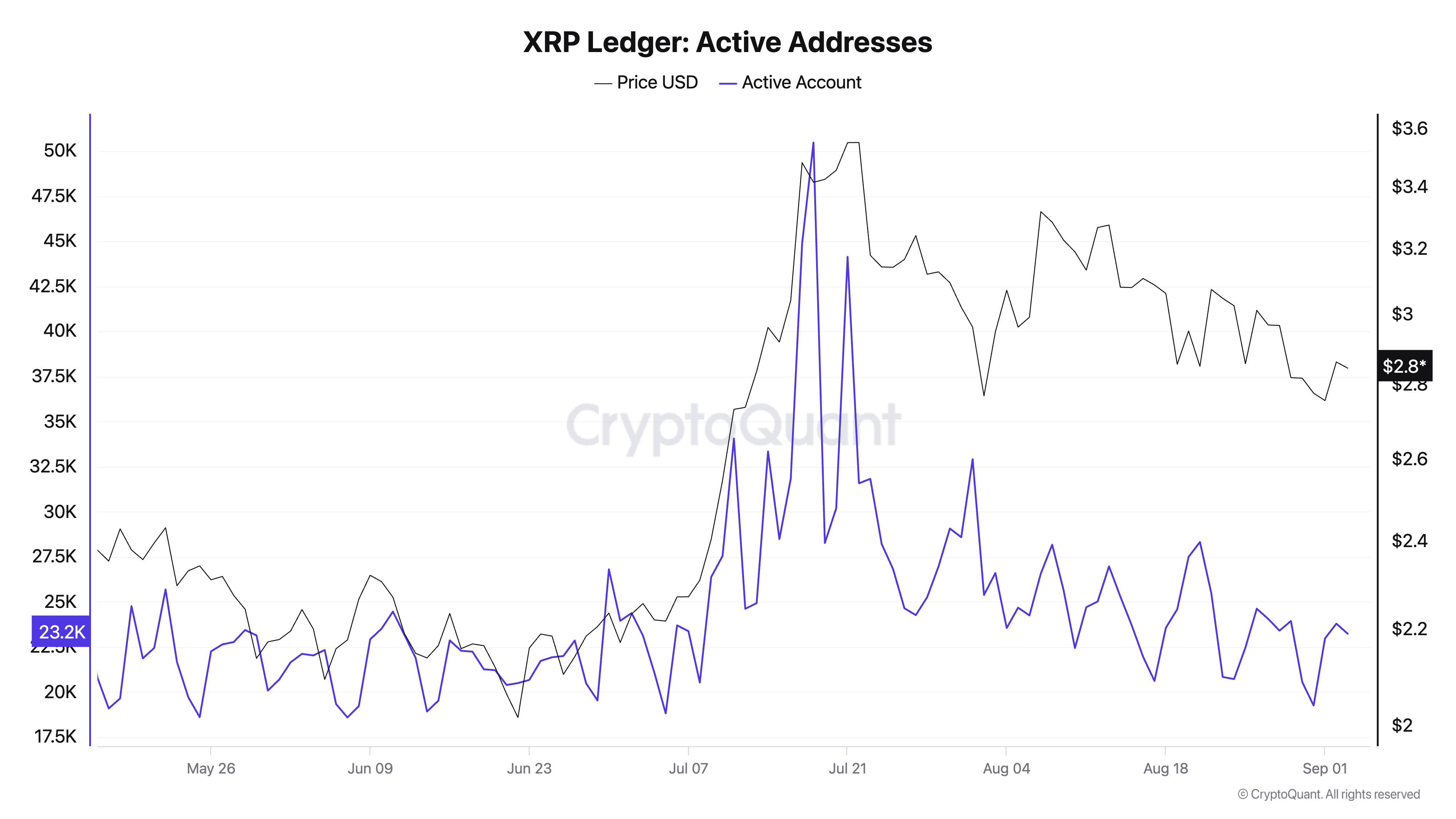 On-chain activity on the XRP Ledger (XRPL) has also slowed significantly over the past few weeks. CryptoQuant data indicates a 54% decline in active addresses, from approximately 50,000 on July 18 to around 23,000 on Wednesday.