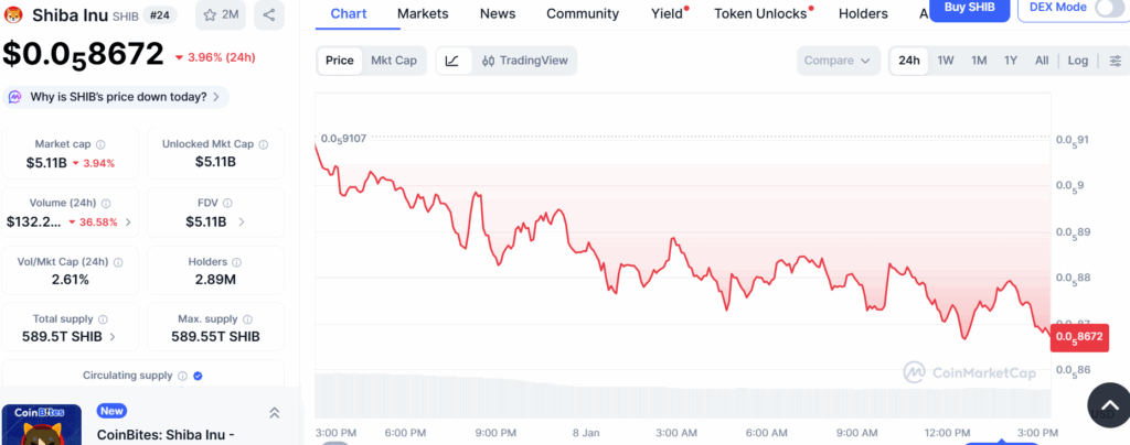 • SHIB price has declined by 3.96% over the last 24 hours.