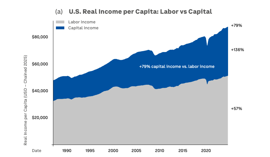 In the United States, labor income has grown by 57% since 1987, while capital income has surged by 136%, creating what Armstrong describes as a structural impediment to broad-based prosperity.