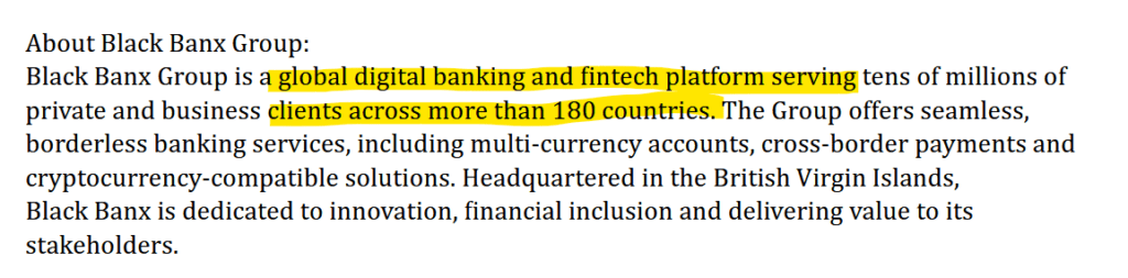 In its Q3 2025 results communication, Black Banx describes itself as a “global digital banking and fintech platform” offering “borderless banking services,” includingIn its Q3 2025 results communication, Black Banx describes itself as a “global digital banking and fintech platform” offering “borderless banking services,” including