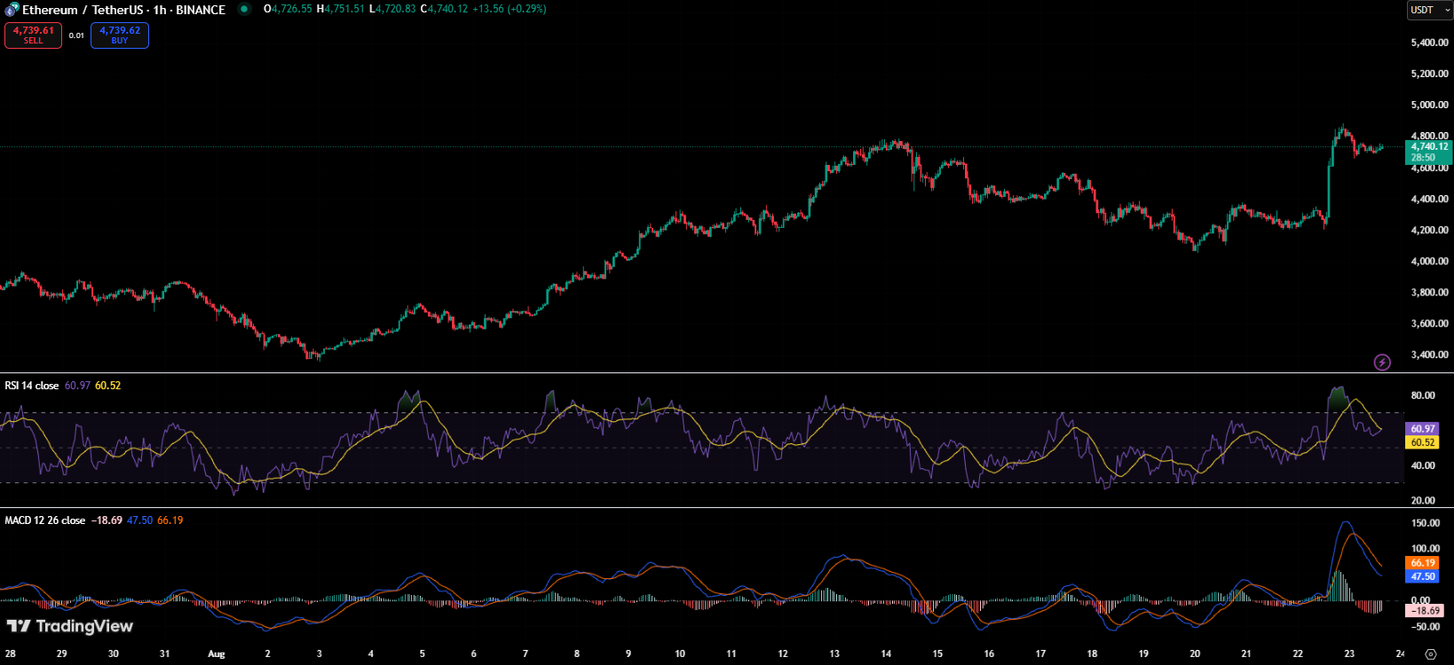 The intraday chart shows ETH recently spiking above $4,750 before stabilizing just under that level. The surge pushed momentum indicators higher, but traders are watching closely to see if the asset holds its gains or retraces into support zones near $4,500 and $4,200.