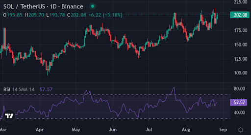 Solana trades between $183.88 and $220.07 today. It jumped 14.82% in 7 days, trimmed that pace to a 7.27% gain over 30 days, and still holds a strong 46.93% rise across 6 months. The mood is positive, yet buyers and sellers keep tugging near $200.