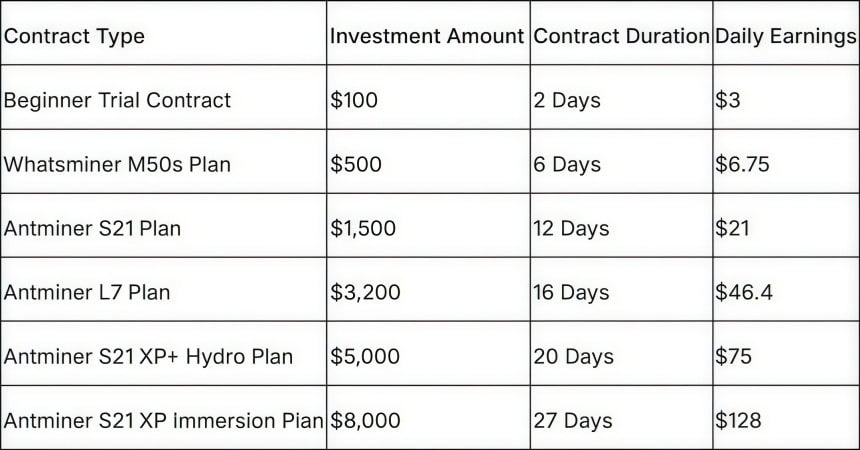2. Choose a Mining Contract: Select a plan that fits your investment goals—from beginner-friendly options to high-yield contracts.