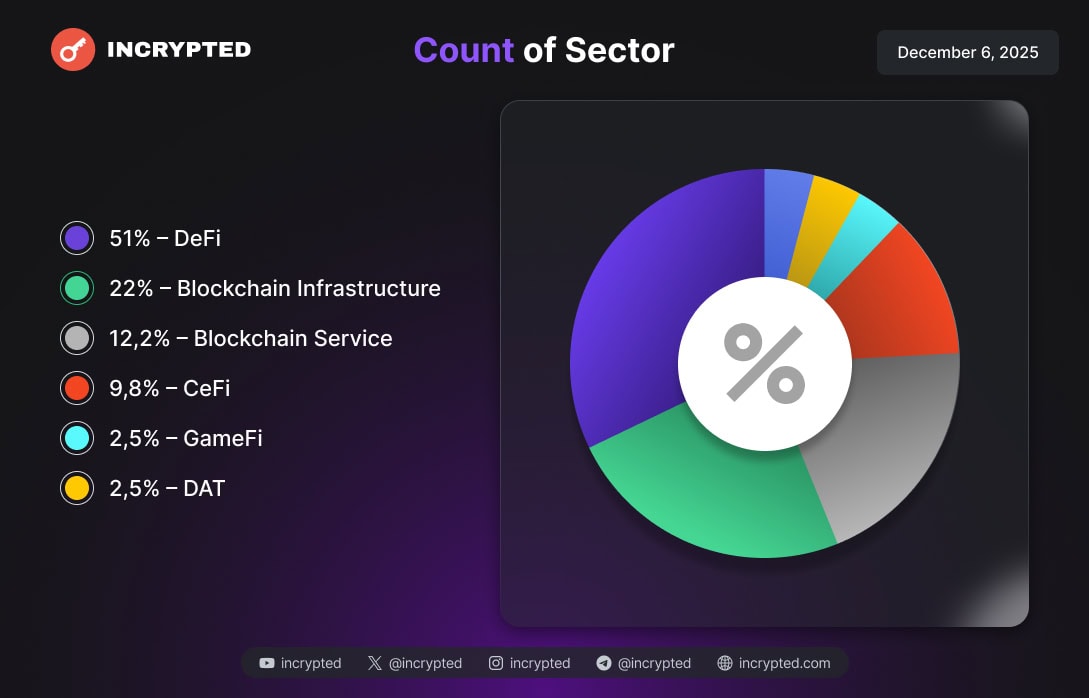 In the period from 1 to 6 December, projects from such segments as DeFi, blockchain infrastructure, blockchain services, CeFi, GameFi, and DAT attracted funding. Investors focused on DeFi.