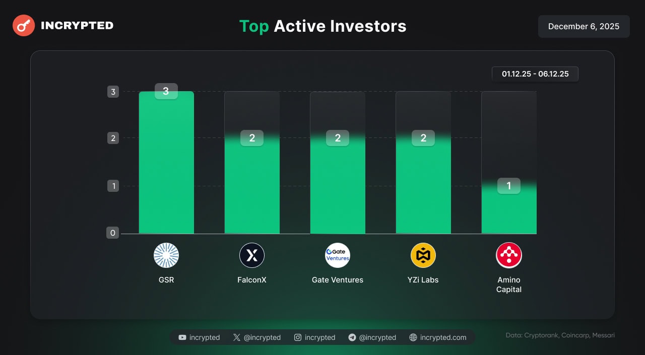 The most active investors of the week were GSR, FalconX, Gate Ventures, YZi Labs, and Amino Capital, according to CryptoRank.