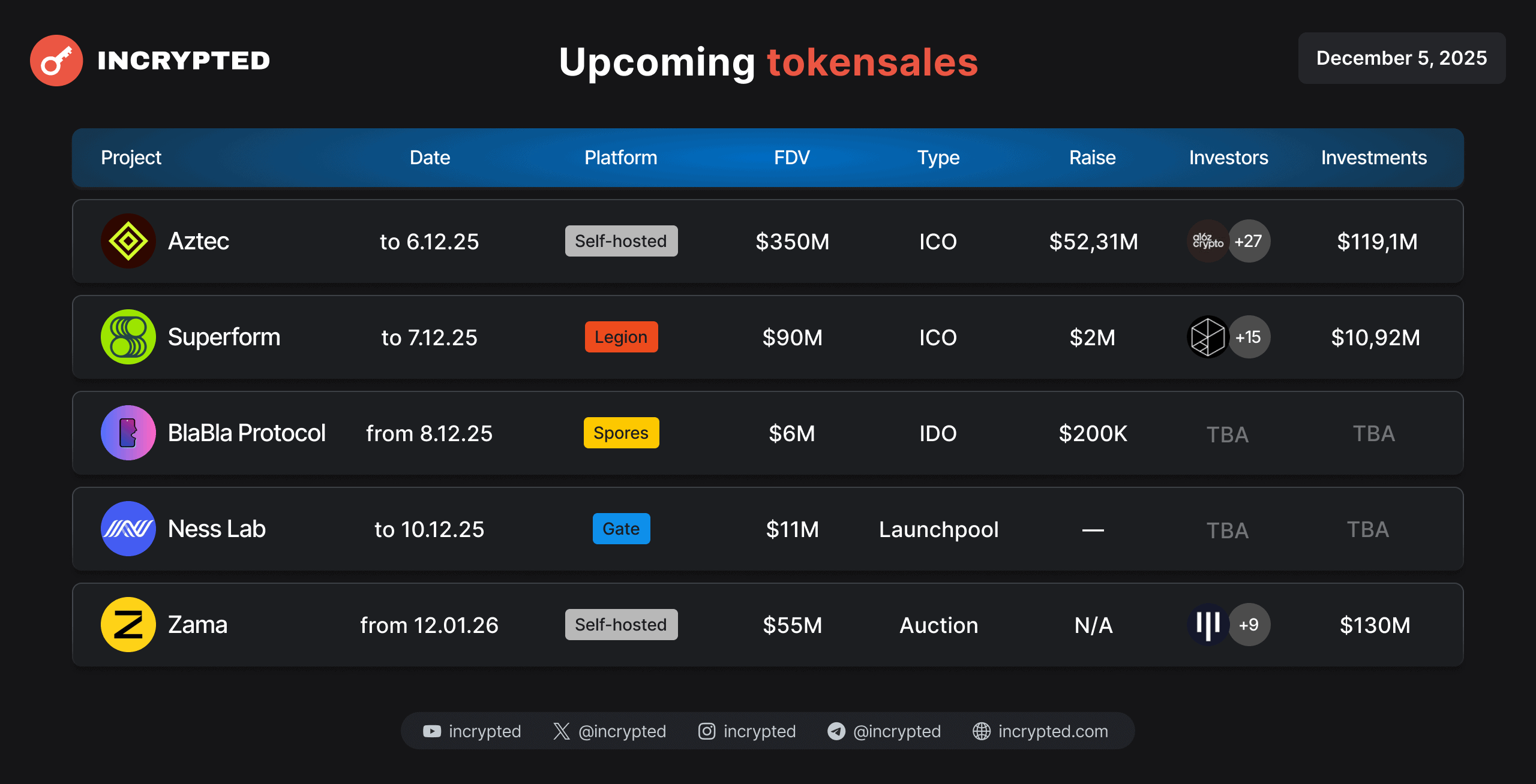 Between December 1 and 6, 2025, Incrypted recorded 41 investment deals, with 20 totaling over $224 million. These included traditional venture fundraising, token sales, accelerators, and more. We provide more details in our weekly digest.