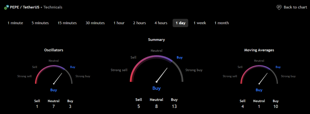 The technical analysis indicators such as Relative Volume (RVOL), Moving Average (MA), and Relative Strength Index (RSI) of Pepe (PEPE) are shown in the chart below.