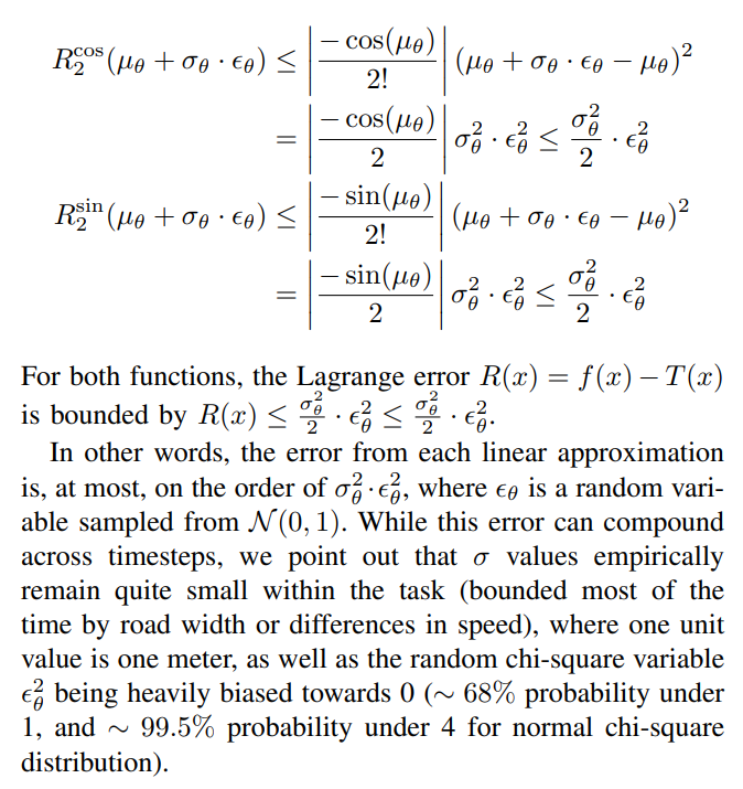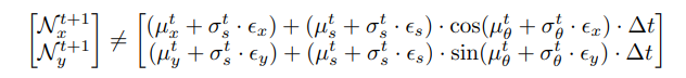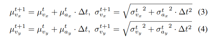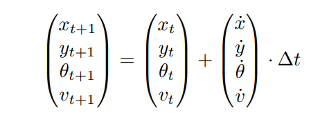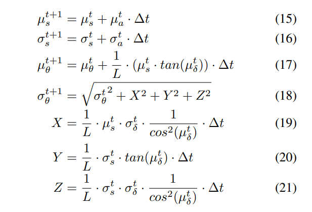 \ We use Euler time integration in forward simulation of the kinematic model to obtain future positions. As we will show later, explicit Euler time integration is simple for handling Gaussian distributions, despite being less precise than higher-order methods like Runge-Kutta. Furthermore, higher-order methods are also difficult to implement in a parallelizable and differentiable fashion, which would add additional overhead as a tradeoff for better accuracy. An agent’s state is propagated forward from timestep t to t + 1 with the following, given a timestep interval ∆t: