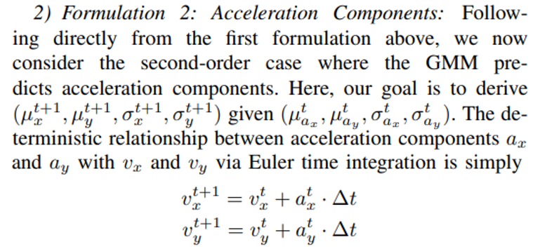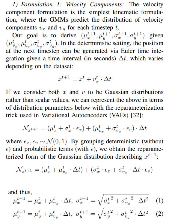 1. Formulation 1: Velocity Components: The velocity component formulation is the simplest kinematic formulation, where the GMMs predict the distribution of velocity components vx and vy for each timestep t.