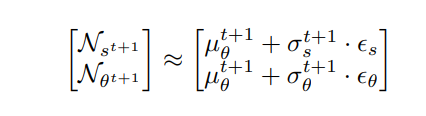 \ \ Where L is the length of the agent. When we represent this process probabilistically as random Gaussian variables, we solve for the distributions of first-order variables, speed (s) and heading (θ):