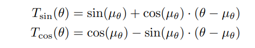 \ \ To amend this, we instead replace cos(·) and sin(·) with linear approximations T(·) evaluated at µθ.