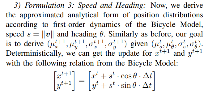 \ We refer to this model throughout this paper to derive the relationship between predicted distributions of kinematic variables and the corresponding distributions of positions x and y for the objective trajectory prediction task.