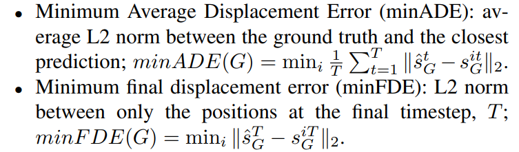 \ We evaluate our model’s performance on Mean Average Precision (mAP), Minimum Average Displacement Error (minADE), minimum final displacement error (minFDE), and Miss Rate, similarly to [8]. We reiterate their definitions below for convenience.