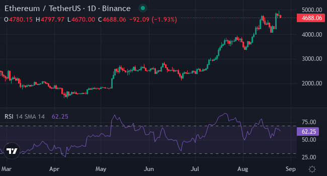 Ethereum traded between $4245 and $5136 this week. The coin is up 4.94% in 7 days, 26.08% in a month, and 88.36% over six months. The 10-day average sits at $4740.59, just above the 100-day line at $4593.48. That steady climb keeps eyes on the next move.