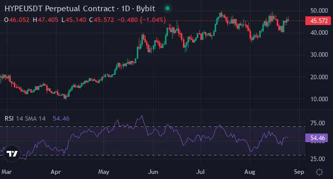 HYPE slipped about 1% this week, but it still shows a 3% climb in the past month and a huge 126% jump over six months. The coin now trades between $41.97 and $48.51, sitting a touch under its 10-day average of $46.07 and slightly above the 100-day line of 43.48. That mix points to a market that cooled off short term yet keeps a long-run uptrend alive.