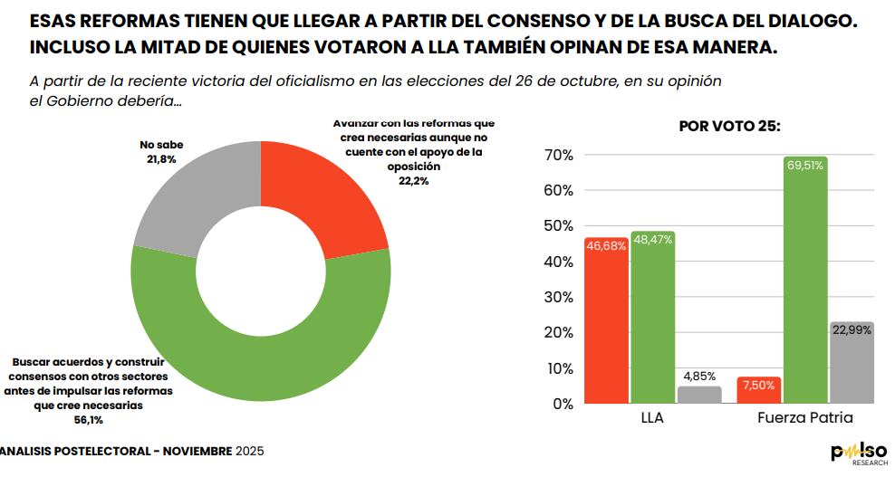 Sin embargo, en otra advertencia para Milei, el apoyo popular no es un cheque en blanco. A pesar de la victoria, la mayoría sostiene que las reformas deben hacer en base a consensos y acuerdos.