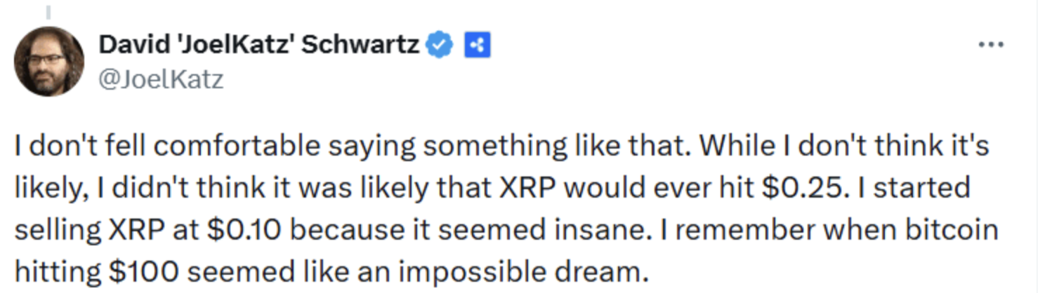 A pesar de rechazar lo que considera una exageración poco realista, Schwartz se abstuvo de declarar imposible un precio de $100 para XRP.