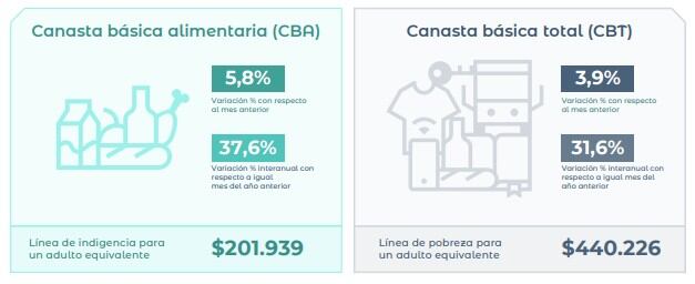 Así, una familia tipo, compuesta por un varón de 35 años, una mujer de 31 años, un hijo de 6 años y una hija de 8 años, necesitó $ 1.360.269 para no ser pobre. Ese mismo hogar, formado por dos adultos y dos menores, requirió $ 623.990 para cubrir sus necesidades básicas de alimentación y no caer en situación de indigencia.