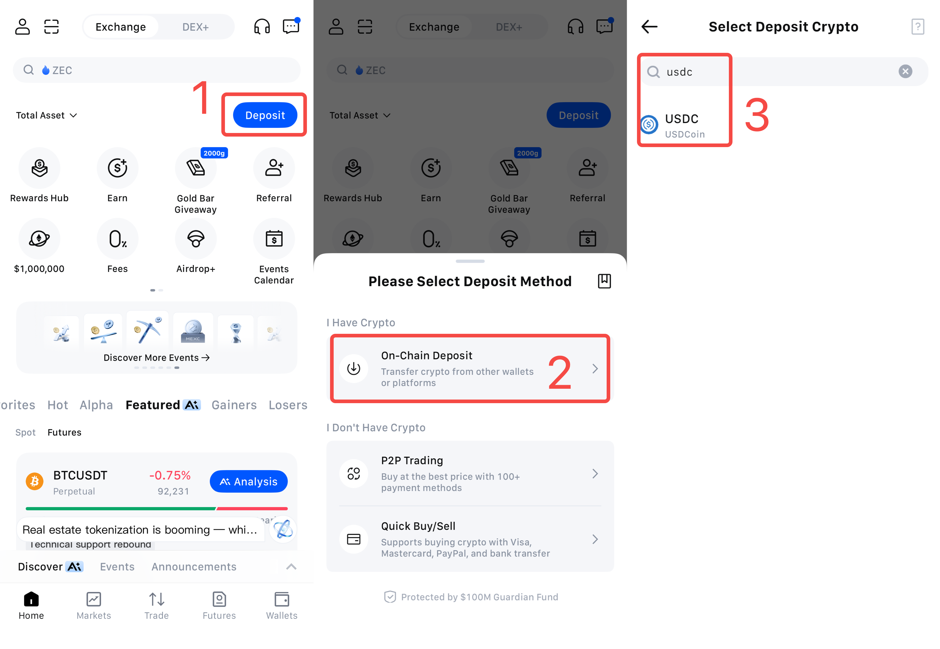 3) Selecciona Depósito en cadena para visualizar la sección Seleccionar cripto para depositar.