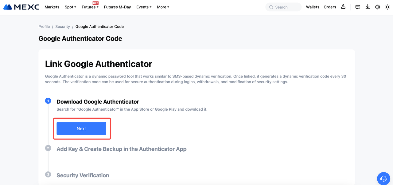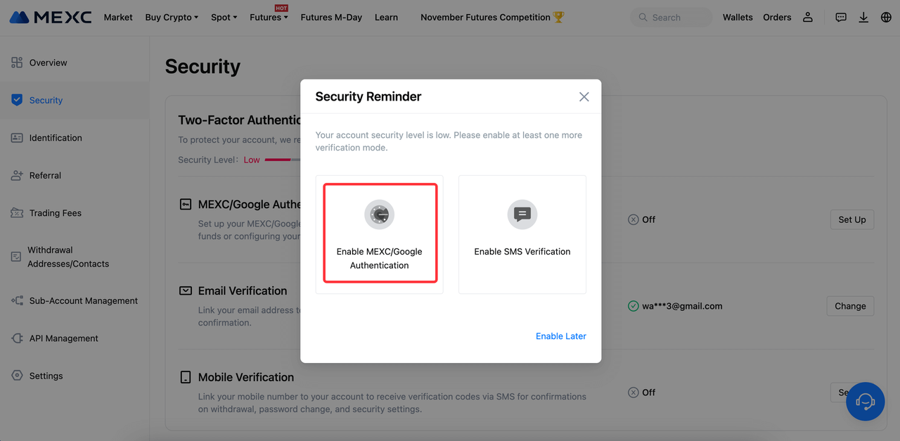 2) روی گزینه فعال سازی MEXC/Google Authentication (گوگل آتنتیکیتور) کلیک کنید.