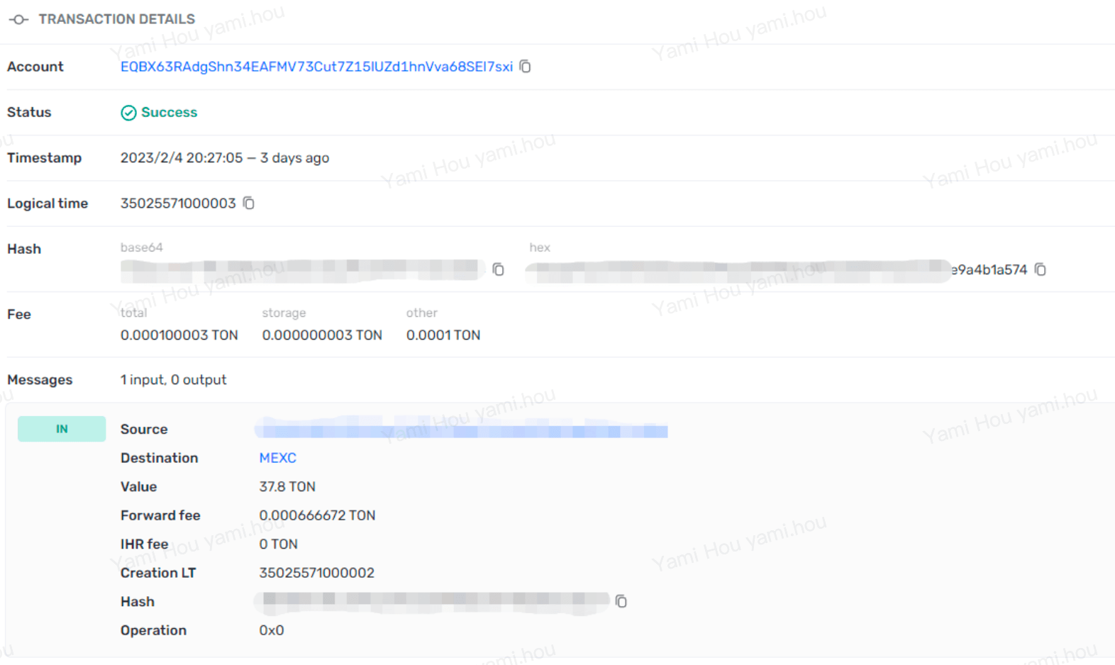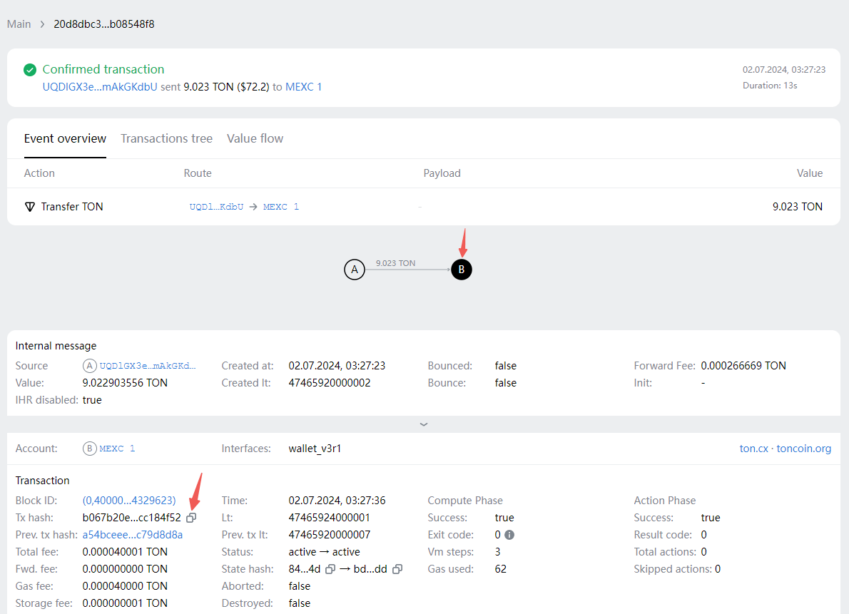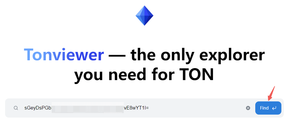 - Open the block explorer at https://tonviewer.com/ and enter your TxID. The following is an example:
