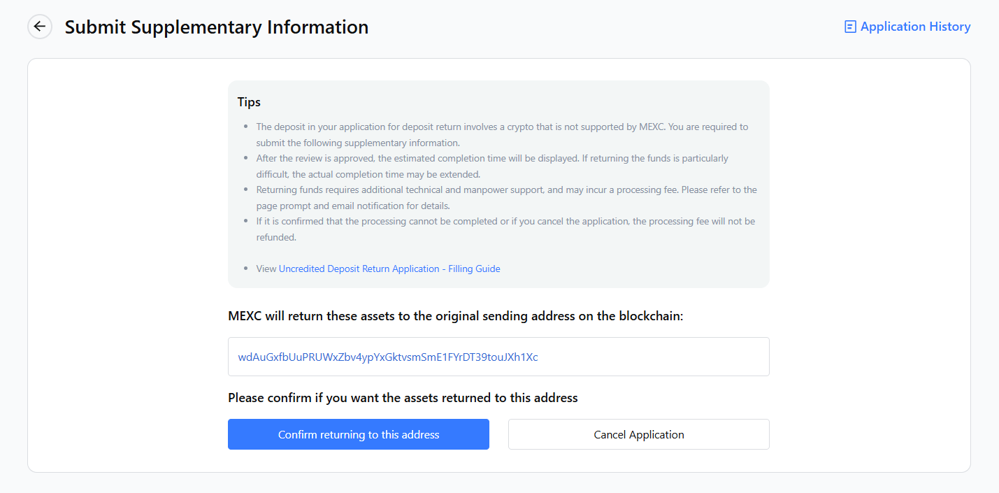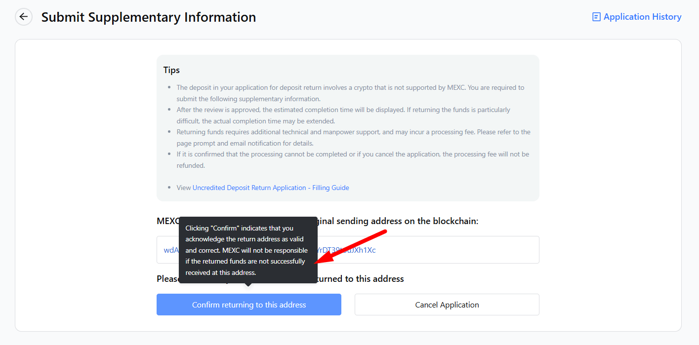 - Once you click [Confirm Return to This Address], you confirm that the address is valid and correct. After this, if you are unable to successfully receive the returned funds at this address, MEXC will not be responsible.
