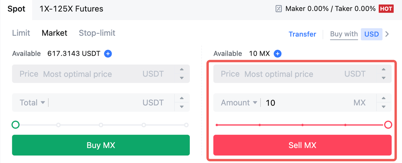 Mahalagang tandaan na kapag ang mga presyo sa merkado ay lubhang pabagu-bago, ang paggamit ng isang order sa merkado ay maaaring magresulta sa panghuling presyo ng pagpapatupad na naiiba mula sa unang presyo na ipinakita sa user. Halimbawa, kung ang kasalukuyang presyo ng MX ay 2.94 USDT at naglagay ka ng market order para sa 294 USDT para makabili ng 100 MX token, maaaring mag-iba-iba ang presyo sa pagitan ng oras kung kailan ka nag-click para bumili at kapag naisakatuparan ang order, na nagiging sanhi ng aktwal na dami ng mga MX token na maging iba sa 100.
