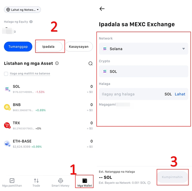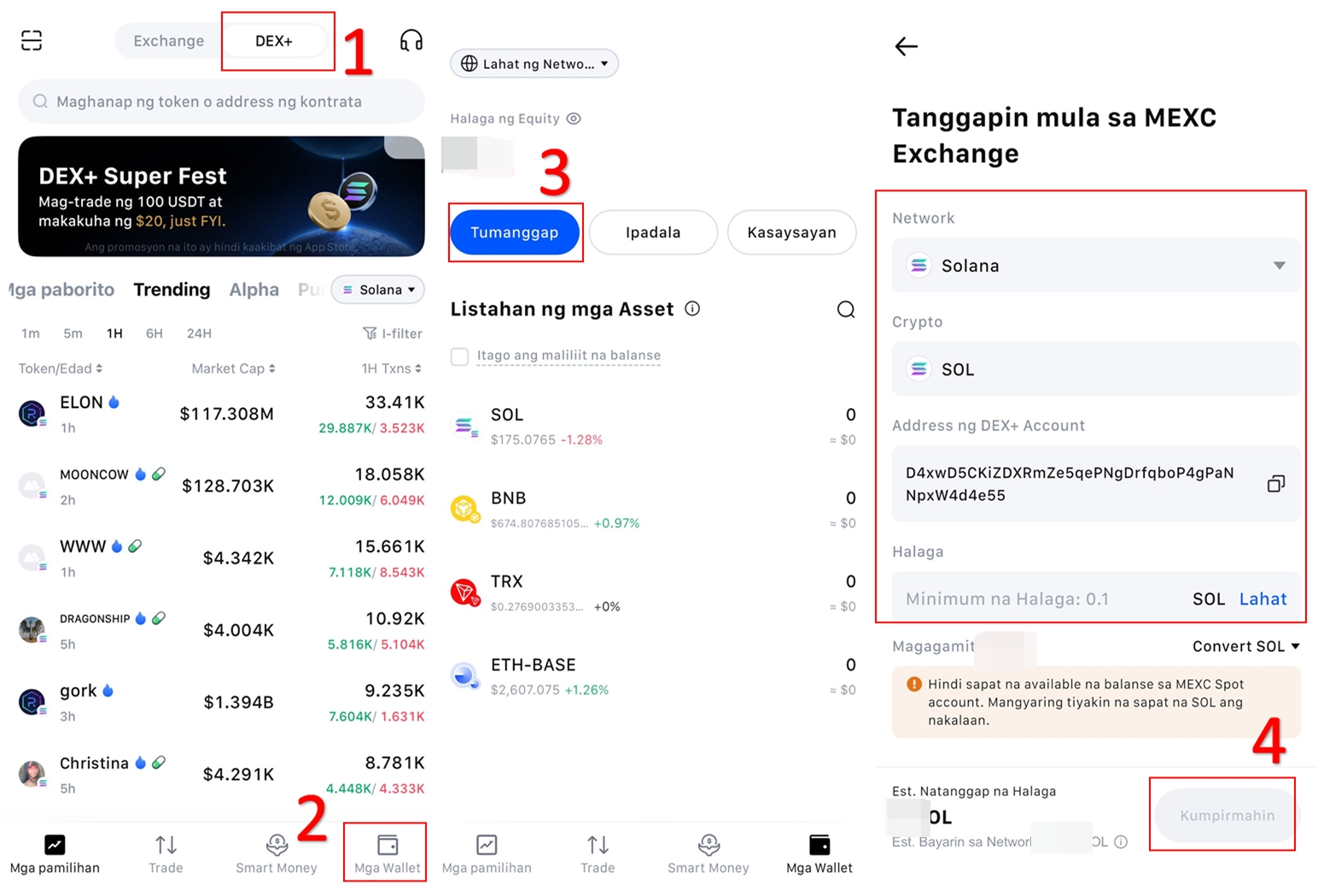 Sa pahina ng DEX+, piliin ang Wallets, i-tap ang Tumanggap, piliin ang Crypto at Network, ilagay ang Halaga, at pagkatapos ay i-tap ang Kumpirmahin na ilipat ang mga asset mula sa iyong MEXC account patungo sa DEX+.