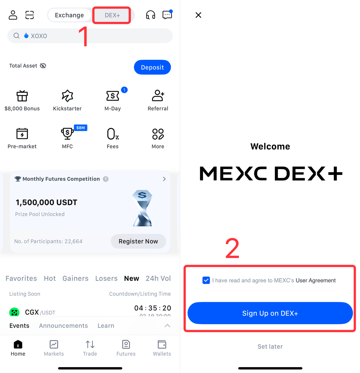 Kung isa ka nang user ng MEXC, buksan ang MEXC App, i-tap ang DEX+ para ma-access ang pahina, suriin at sumang-ayon sa kasunduan ng user, pagkatapos ay i-tap ang Mag-sign Up sa DEX+ para i-activate ang iyong DEX+ account.