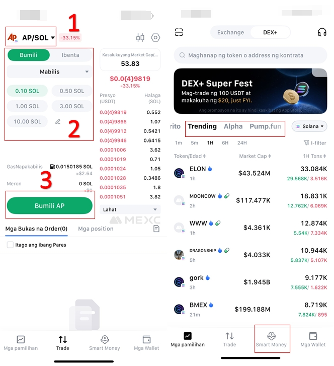 3) Kapag pumipili ng token na itra-trade, maaari mong tingnan ang detalyadong impormasyon tungkol sa token sa pahina ng Merkado upang masuri ang mga potensyal na panganib. Bukod pa rito, maaari mong i-filter ang mga token sa pamamagitan ng mga listahan tulad ng Trending, Alpha, Pump.fun, at Smart Money.