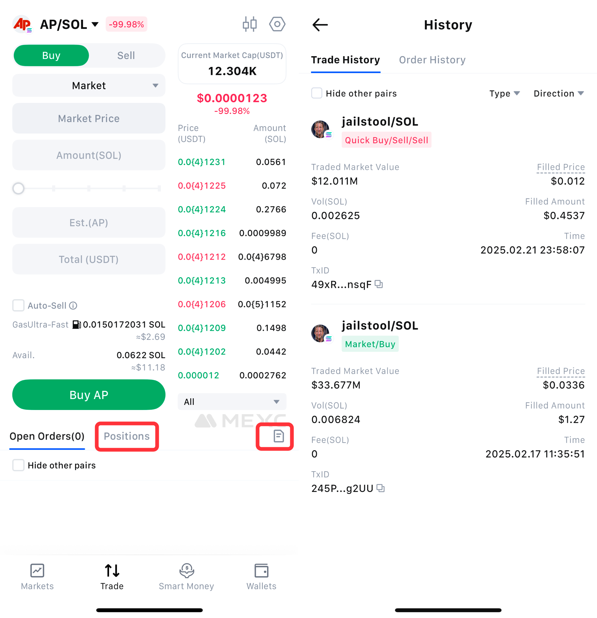 Pagkatapos makumpleto ang isang kalakalan, maaari mong makita ang iyong kasalukuyang posisyon sa ilalim ng Mga Posisyon sa ibaba ng pahina ng Trade. I-tap ang icon ng notebook sa tabi nito para pumunta sa Kasaysayan ng Trade, kung saan makikita mo ang iyong mga nakaraang mga rekord ng kalakalan.