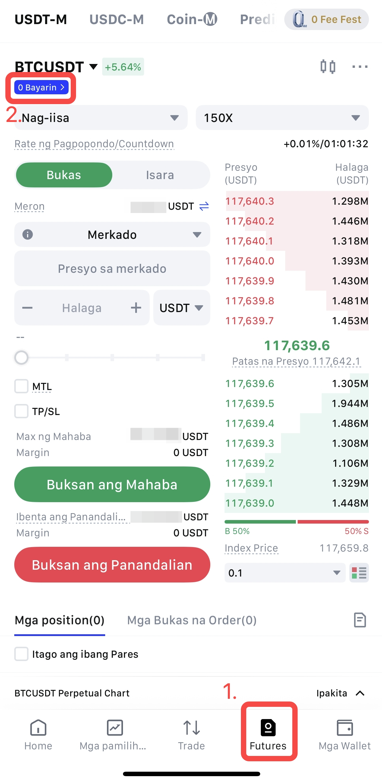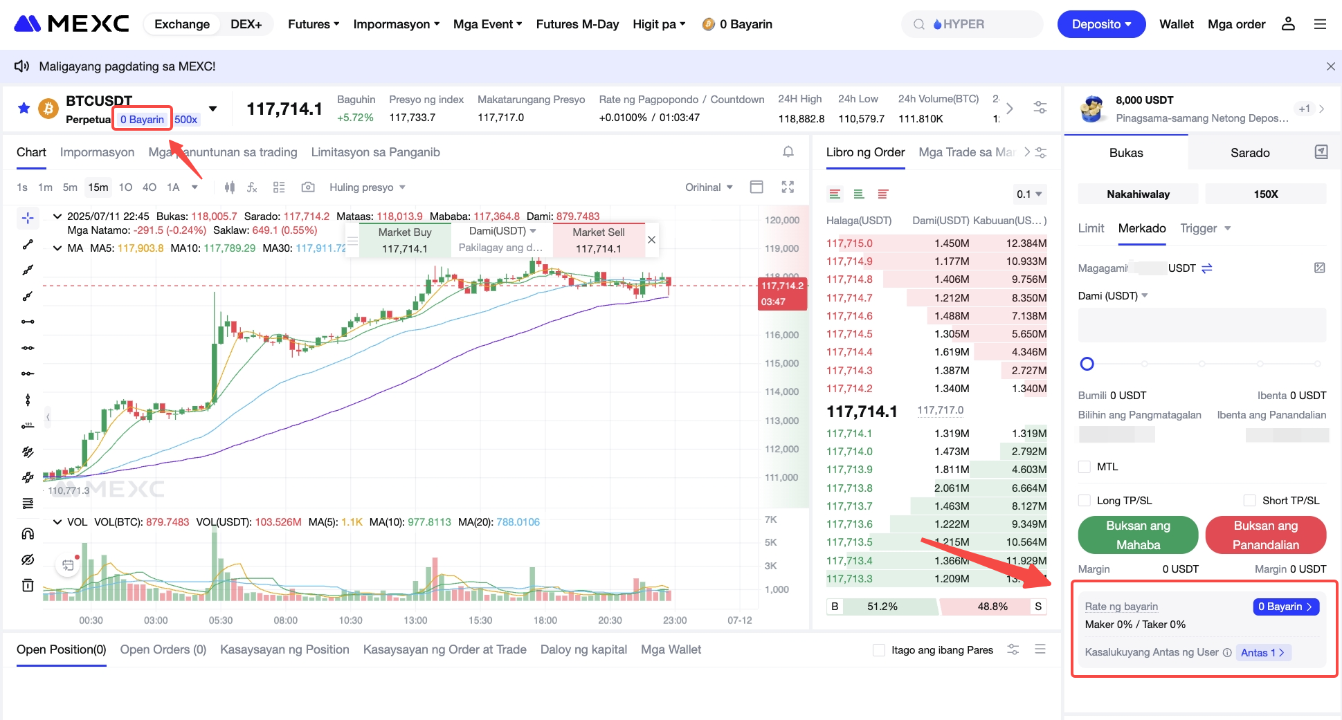 Pagkatapos mag-login, mag-navigate sa pahina ng Futures trading, at hanapin ang 0 Bayarin tag sa ibaba mismo ng trading pair, o hanapin ang seksyong Rate ng bayarin sa kanang ibabang sulok.