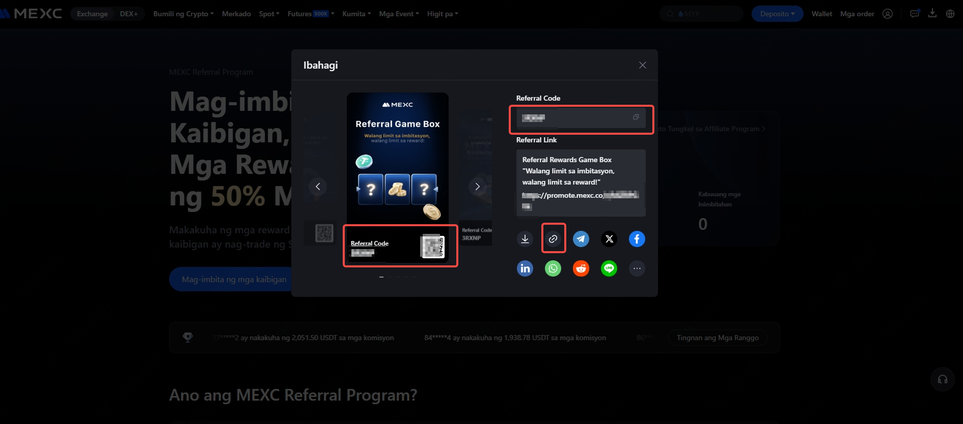 Bilang alternatibo, maaari mong kopyahin ang iyong Referral Link. Kapag binuksan ng mga bagong user ang link na ito sa kanilang browser upang mag-sign up, awtomatikong maia-apply ang iyong referral code.