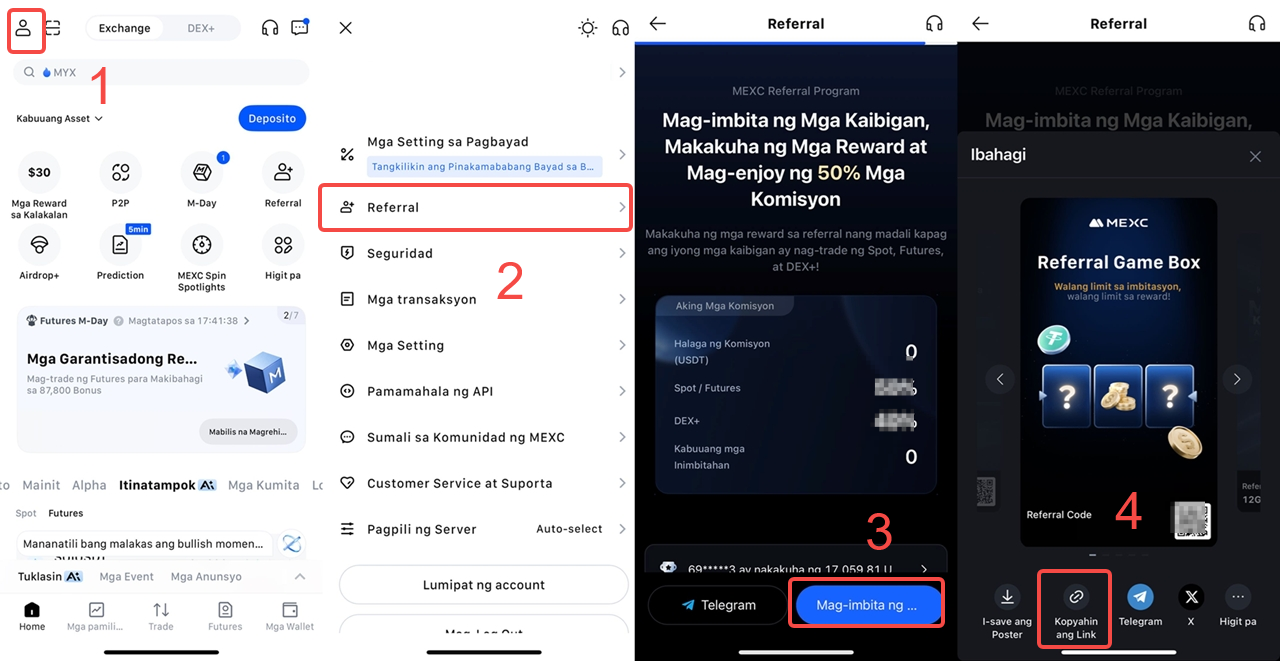 4) Piliin kung kokopyahin ang iyong Referral Code o Referral Link at ipadala ito nang direkta sa mga bagong user na iniimbitahan mo. Maaari ka ring pumili ng naibabahaging template at agad itong ipadala sa mga kaibigan.
