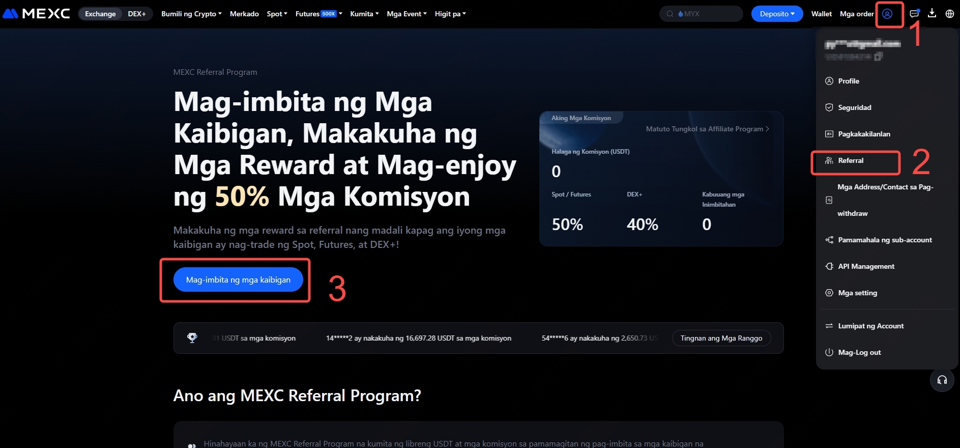 Pumunta sa opisyal na website ng MEXC at mag-log in sa iyong account. Mula sa profile icon, piliin ang Referral. Sa pahina ng Referral, i-click ang Mag-imbita ng Mga Kaibigan.