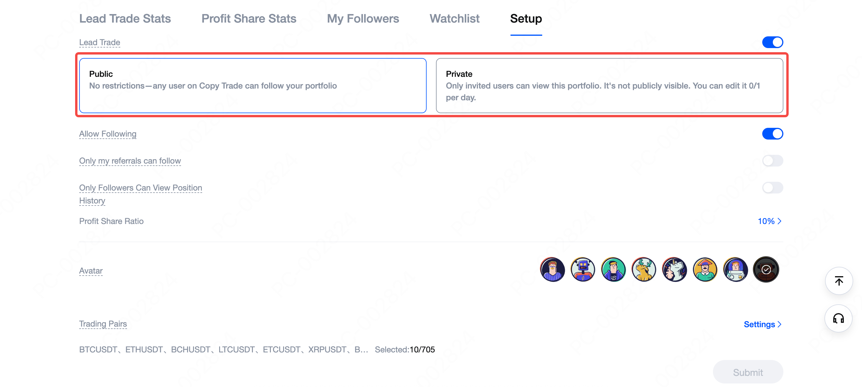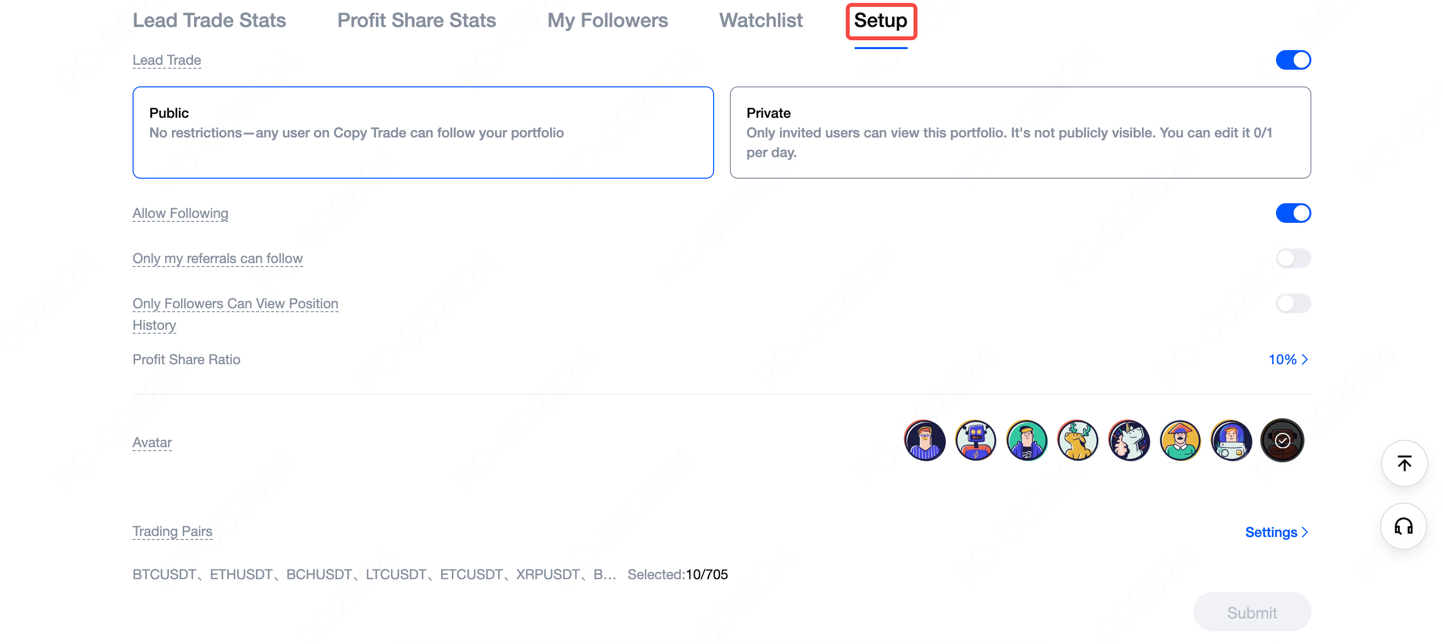 Sa pahina ng Aking Mga Nangungunang Trade, i-click ang Setup. Maaari mong i-toggle ang tampok na lead trade sa on o off, payagan o paghigpitan ang mga tagasunod, paganahin ang opsyon para lamang sa mga tinutukoy na user na sundan, at gawing nakikita lang ng mga tagasunod ang mga talaan ng history ng posisyon. Maaari mo ring itakda ang iyong avatar, kopyahin ang mga pares ng kalakalan, palayaw, at bio. Kapag tapos na, i-click ang Isumite upang ilapat ang mga pagbabago.