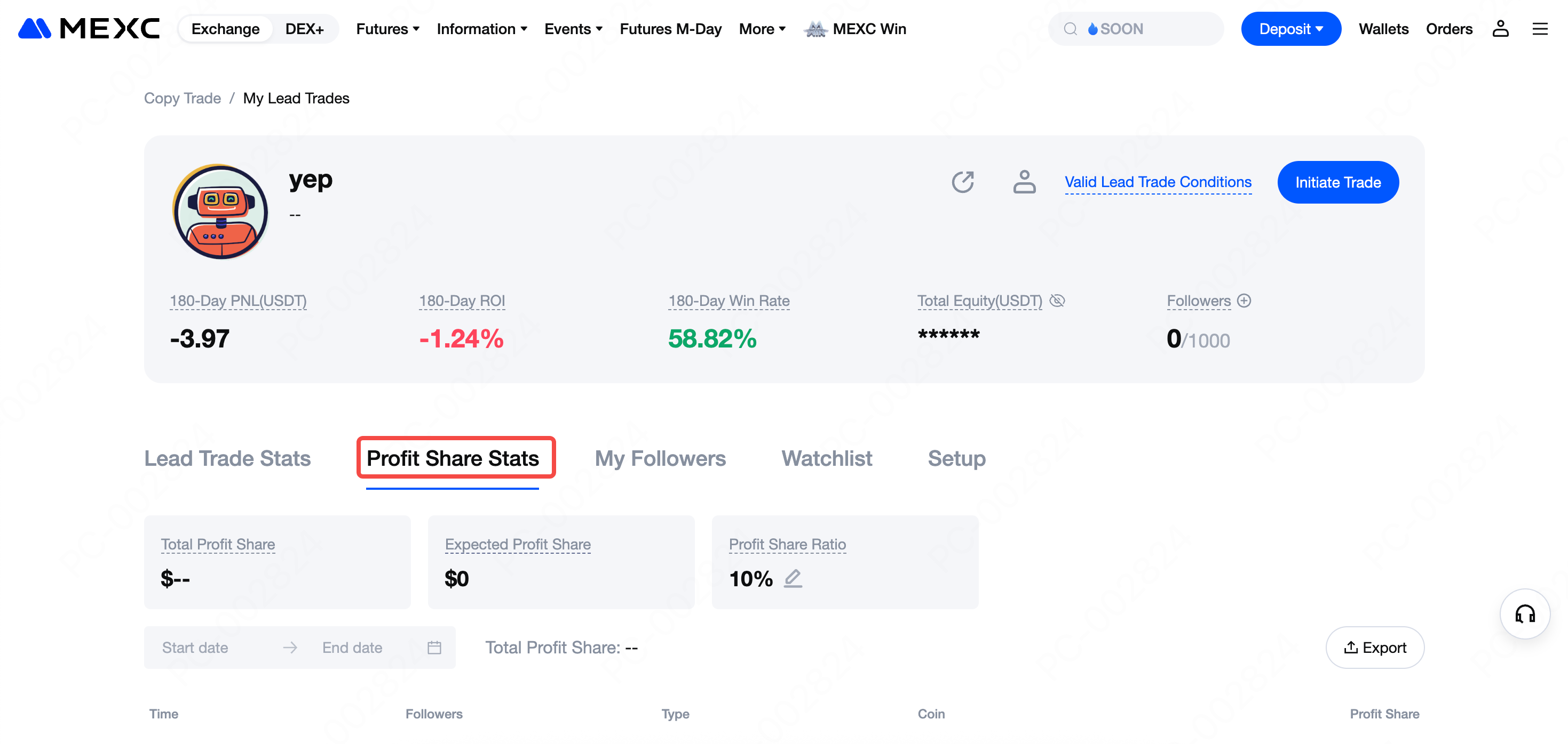 Mga Panuntunan sa Pagbabahagi ng Kita: Ang pagbabahagi ng kita ay binabayaran sa 00:00 (UTC+08:00) bawat araw, na sumasaklaw sa nakaraang 24 na oras. Ang panahon ng settlement ay mula 00:00 sa nakaraang araw (UTC+08:00) hanggang 00:00 sa kasalukuyang araw (UTC+08:00). Nalalapat lamang ang pagbabahagi ng kita kung positibo ang kabuuang kita o pagkawala ng mga tagasubaybay sa panahon.