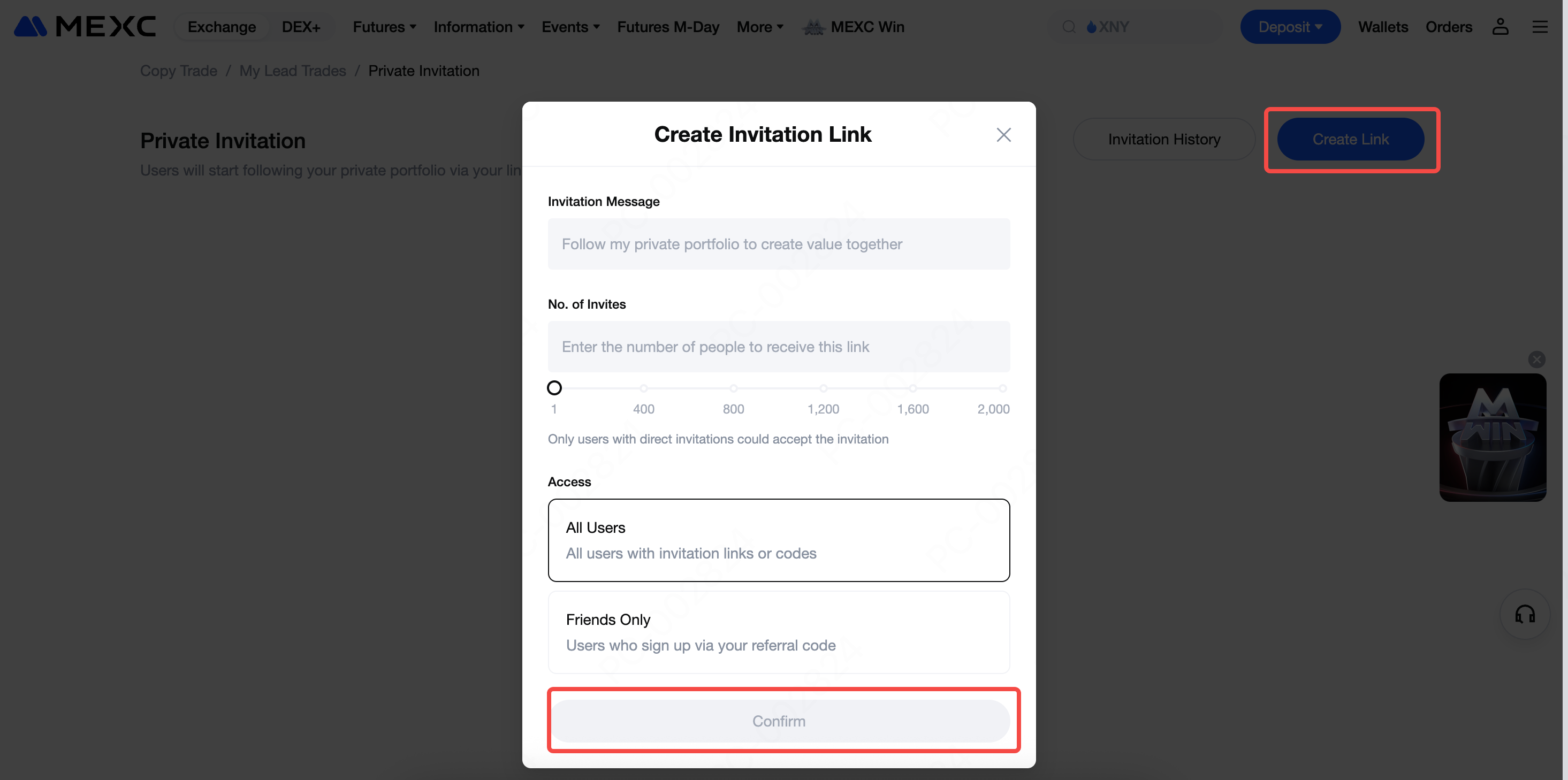 Sa pahina ng Pribadong Imbitasyon, i-click ang Lumikha ng Link, punan ang Mensahe ng Imbitasyon at bilang ng mga imbitasyon, piliin ang saklaw ng imbitasyon, at pagkatapos ay i-click ang Kumpirmahin upang bumuo ng iyong eksklusibong link ng imbitasyon. Maaaring sundan ka ng mga inimbitahang user at simulan ang trading ng kopya sa pamamagitan ng link na ito.