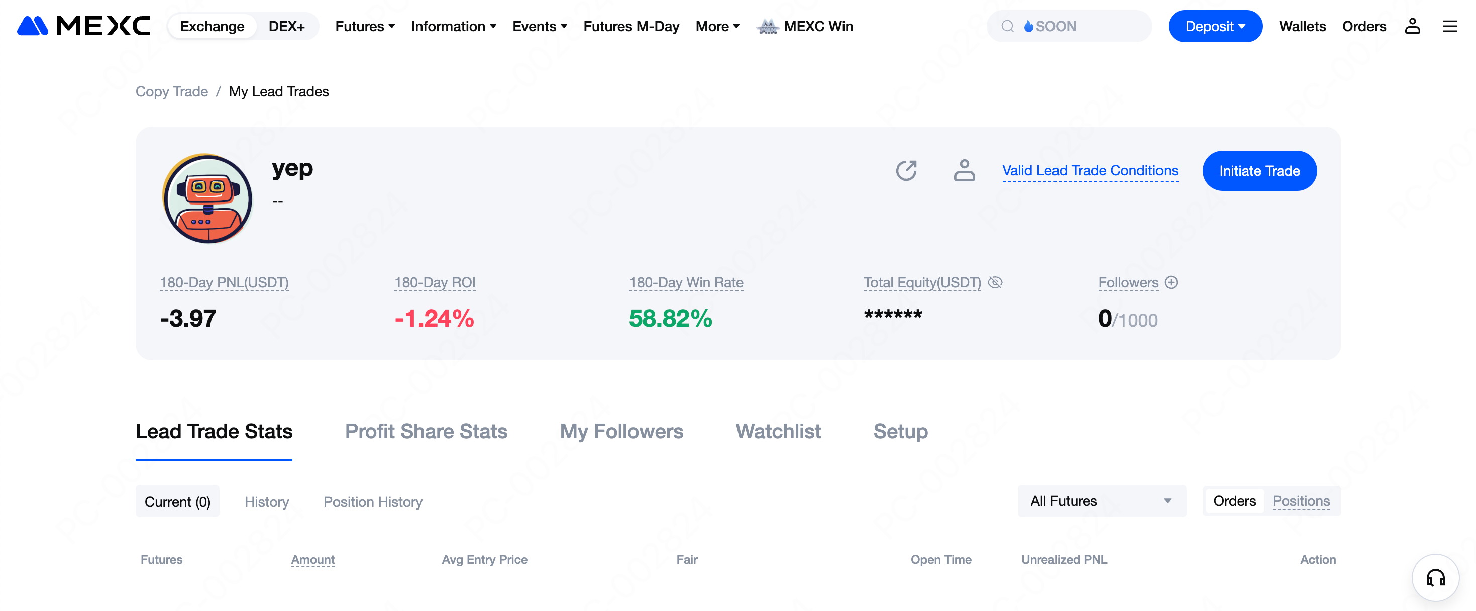 Sa pahina ng Aking Mga Nangungunang Trade, maaari mong tingnan ang iyong mga istatistika ng lead trade, mga istatistika ng pagbabahagi ng kita, iyong mga tagasubaybay, listahan ng panonood, at gumawa ng mga pagpapasadya sa ilalim ng Setup tulad ng iyong palayaw, bio, avatar, at kopya ng mga pares ng trade.