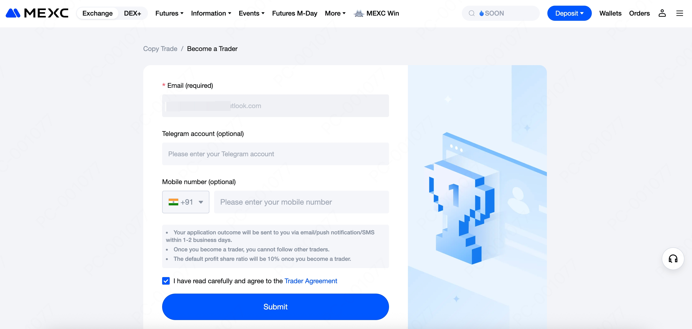 Pagkatapos suriin ang kahon ng Trader Agreement, i-click ang Isumite at hintayin ang mga resulta ng pagsusuri. Ipapadala ng MEXC ang mga resulta ng aplikasyon at aabisuhan ka ng resulta sa pamamagitan ng email, panloob na mensahe, o SMS sa loob ng 1-2 araw ng negosyo. Kapag naaprubahan, maaari mong simulan ang pagkopya ng trade.