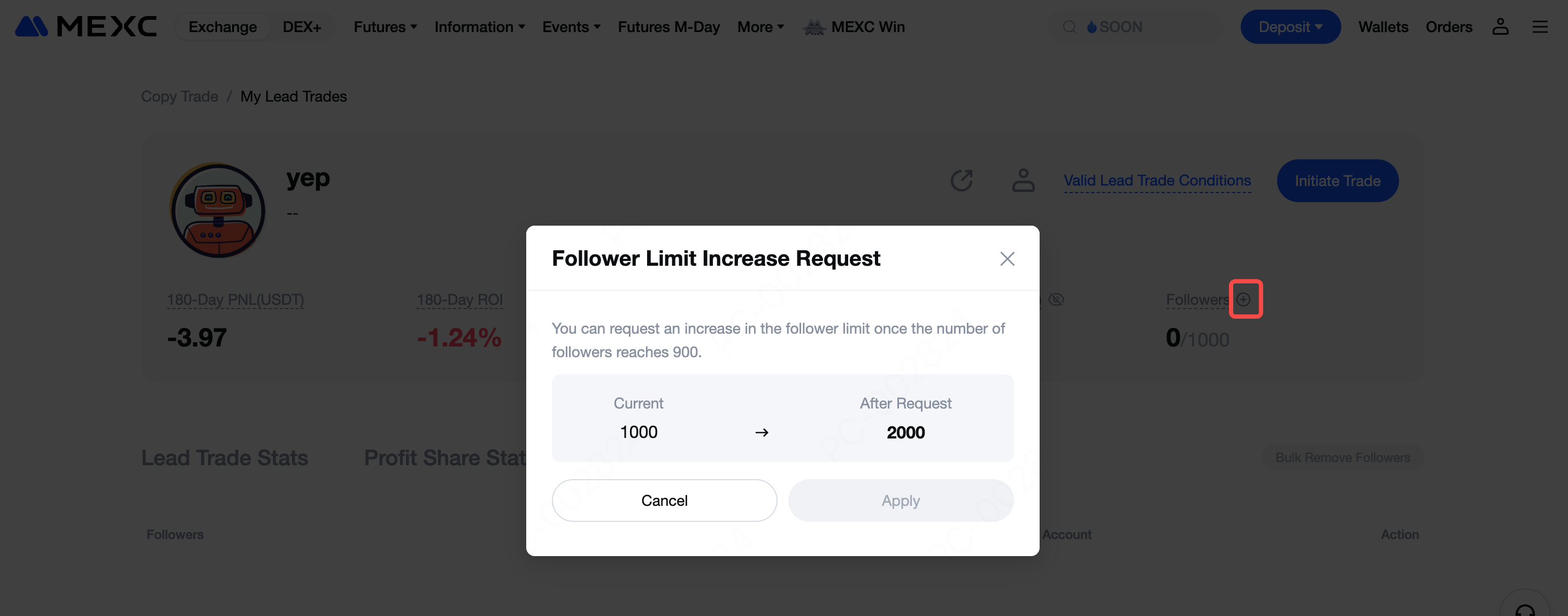 Tandaan: Kapag nag-aaplay upang maging isang trader, hindi mo maaaring sundin ang anumang mga nangungunang trader. Kung kasalukuyan kang sumusunod sa anuman, mangyaring kanselahin at ihinto ang pagsunod sa kanila bago isumite ang iyong aplikasyon. Kapag naging trader ka na, hindi mo na masusundan ang ibang lead traders.