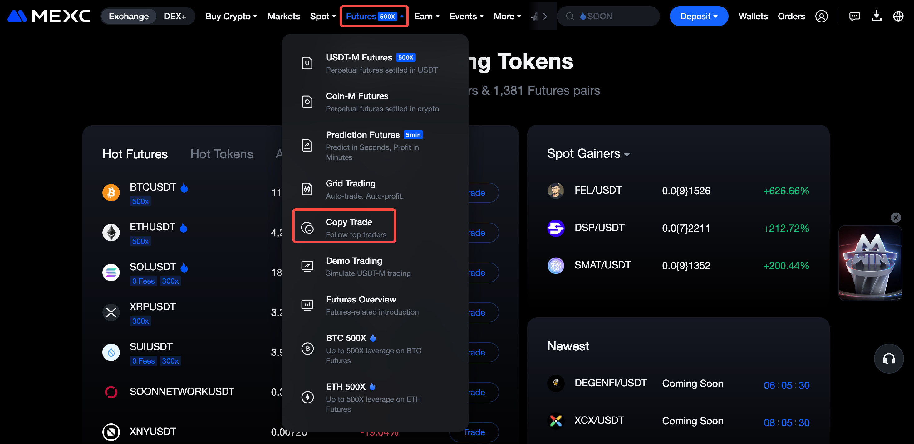 Sa opisyal na website ng MEXC, pumunta sa Futures → Copy Trade, at ilagay ang pahina ng copy trading.